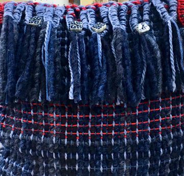 Handwoven on a rigid heddle loom, buttons made with FIMO and similar durable clays.