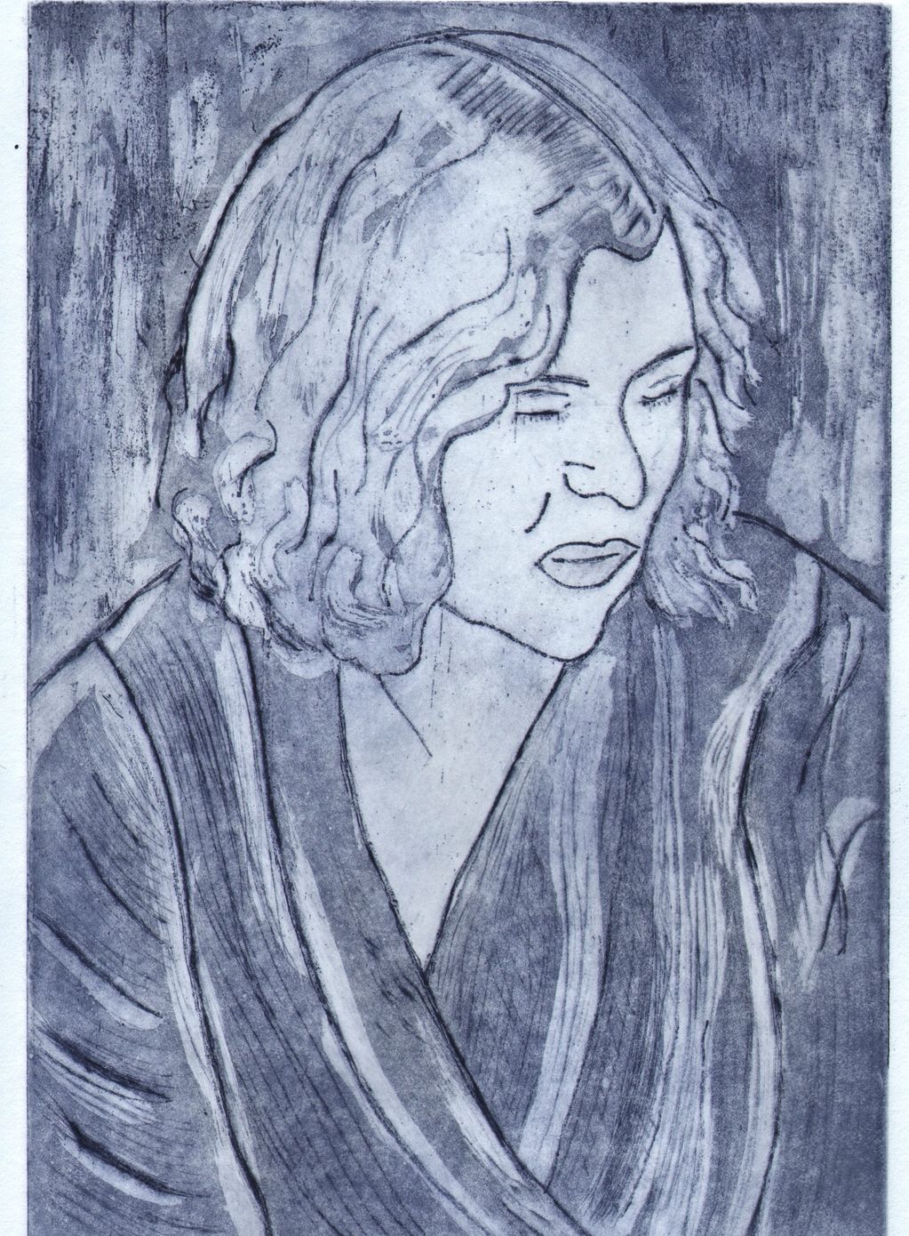 "Pensive 4" - Etching (plate 2) with aquatint and drypoint. Paynes Grey ink on light blue paper.
