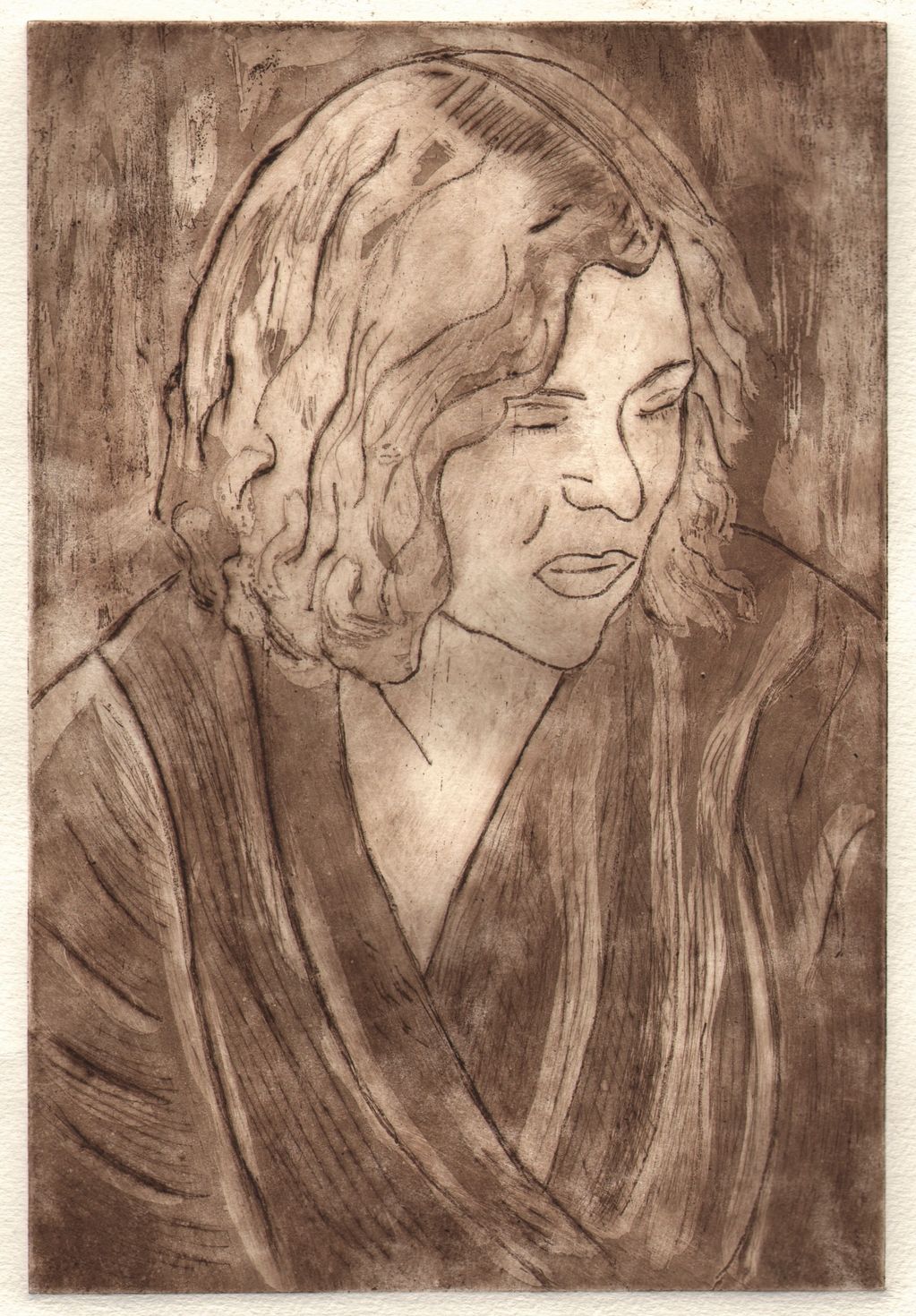"Pensive 6" - Etching (plate 2) with aquatint and drypoint. Sepia ink on brown paper.
