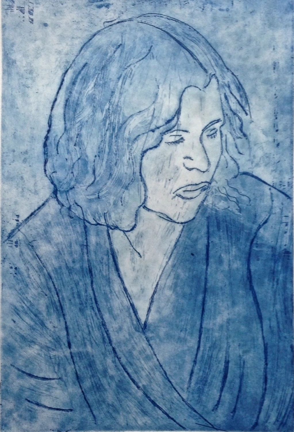 "Pensive 3" - Etching (plate 1) with aquatint and drypoint. Prussian blue ink on light gray paper.