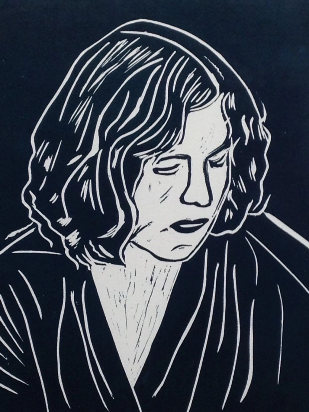 "Pensive 1" - Linocut print. Black ink on white paper.