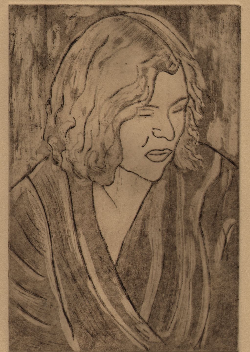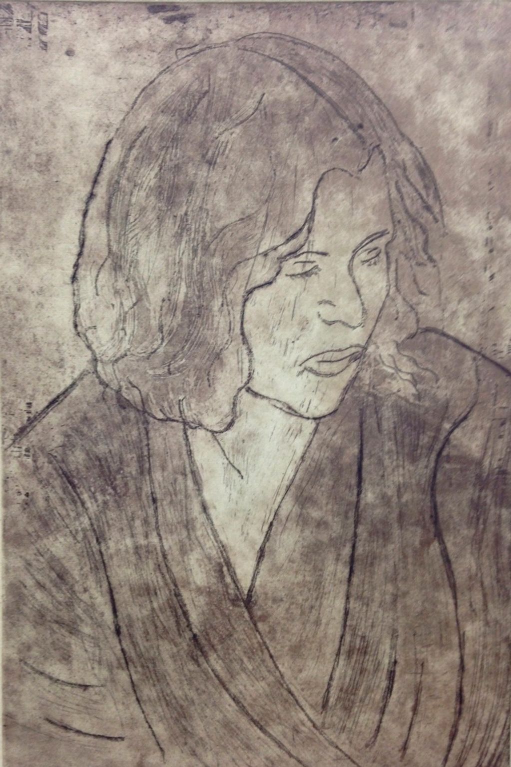 "Pensive 2" - Etching (plate 1) with aquatint and drypoint Bistre ink on cream paper.
