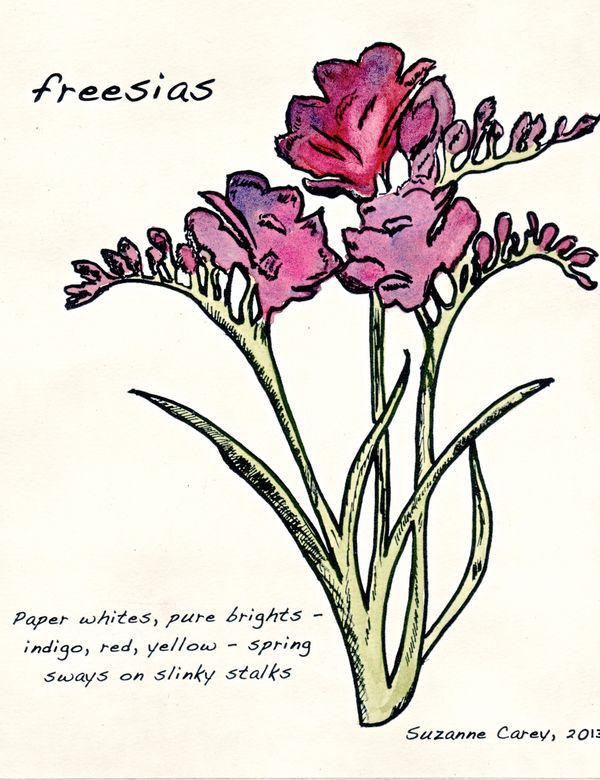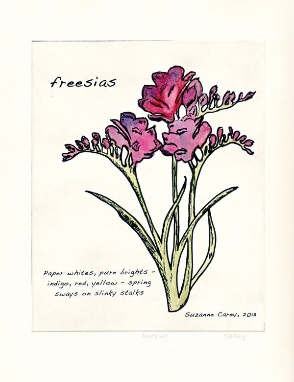 "Freesias" broadside (hand-painted solar etching)